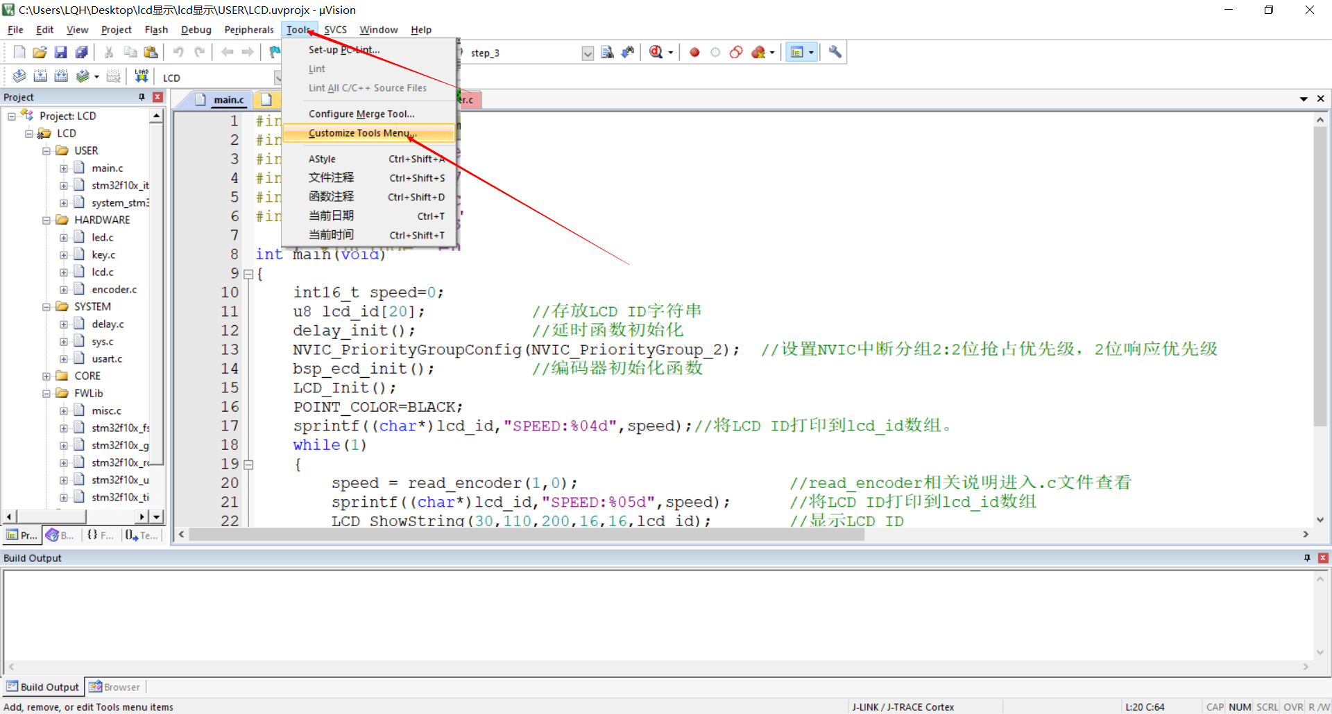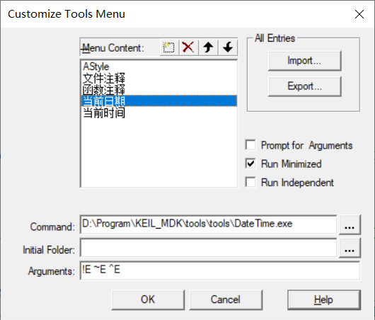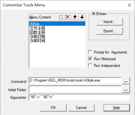Keil使用相关 添加插件¶ 选择用户自定义工具栏设置 新建一个插件名,需要选择插件路径,还有实现代码,可以根据后面几步填写,路径自己选好 格式化文档¶ -n "$E*.c" "$E*.h" 文件注释¶ !E 函数注释¶ !E ~E 插入当前日期¶ !E ~E ^E 插入当前时间¶ !E ~E ^E T 修改注释文件¶ 修改文件注释以及函数注释格式,在Tool中修改以下文件格式即可,File.c是文件注释的格式,function是函数的注释格式。 配置虚拟串口¶ 下载虚拟串口软件 建立一个ini文件,放入下面的代码,COM2就是要使用的串口,S1IN代表串口1 MODE COM2 115200,0,8,1 ASSIGN COM2 < S1IN > S1OUT