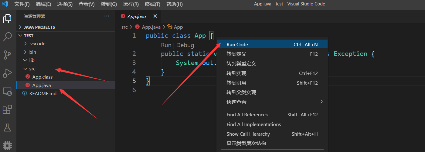 7、点开src中的App.java,然后右键Run Code,便可以执行。在输出就可以看到HelloWorld了。到这里,因该就基本可以了。