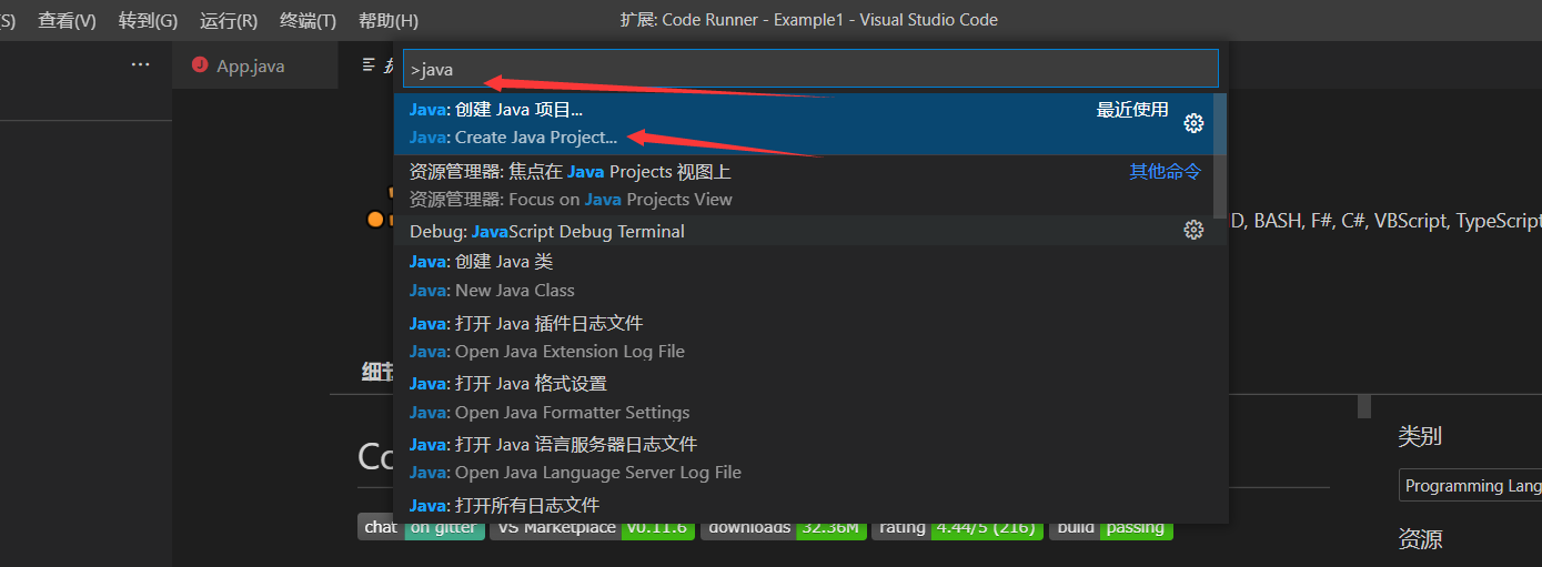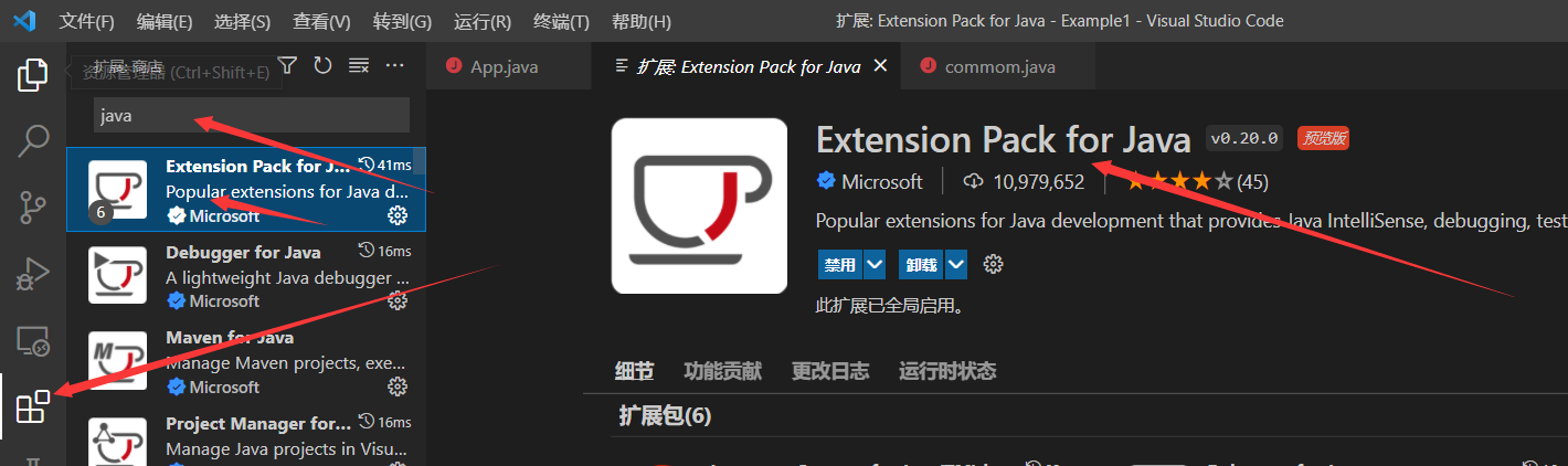 1、插件下载,找到以下两个插件进行安装,第一个会将有关Java的插件装完,第二个是代码运行插件