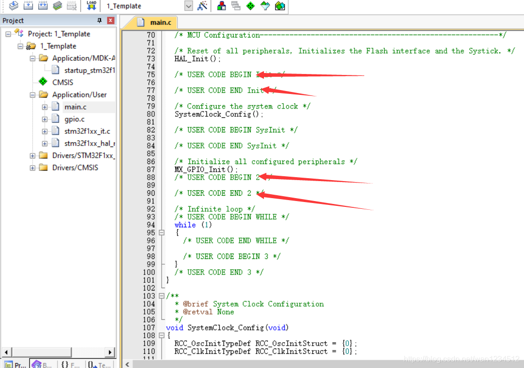 1、只可在CODE BEGIN 和CODE END间编程,其他地方编程如果使用CUBEMX修改参数重新生成代码会将自己写的代码删除。