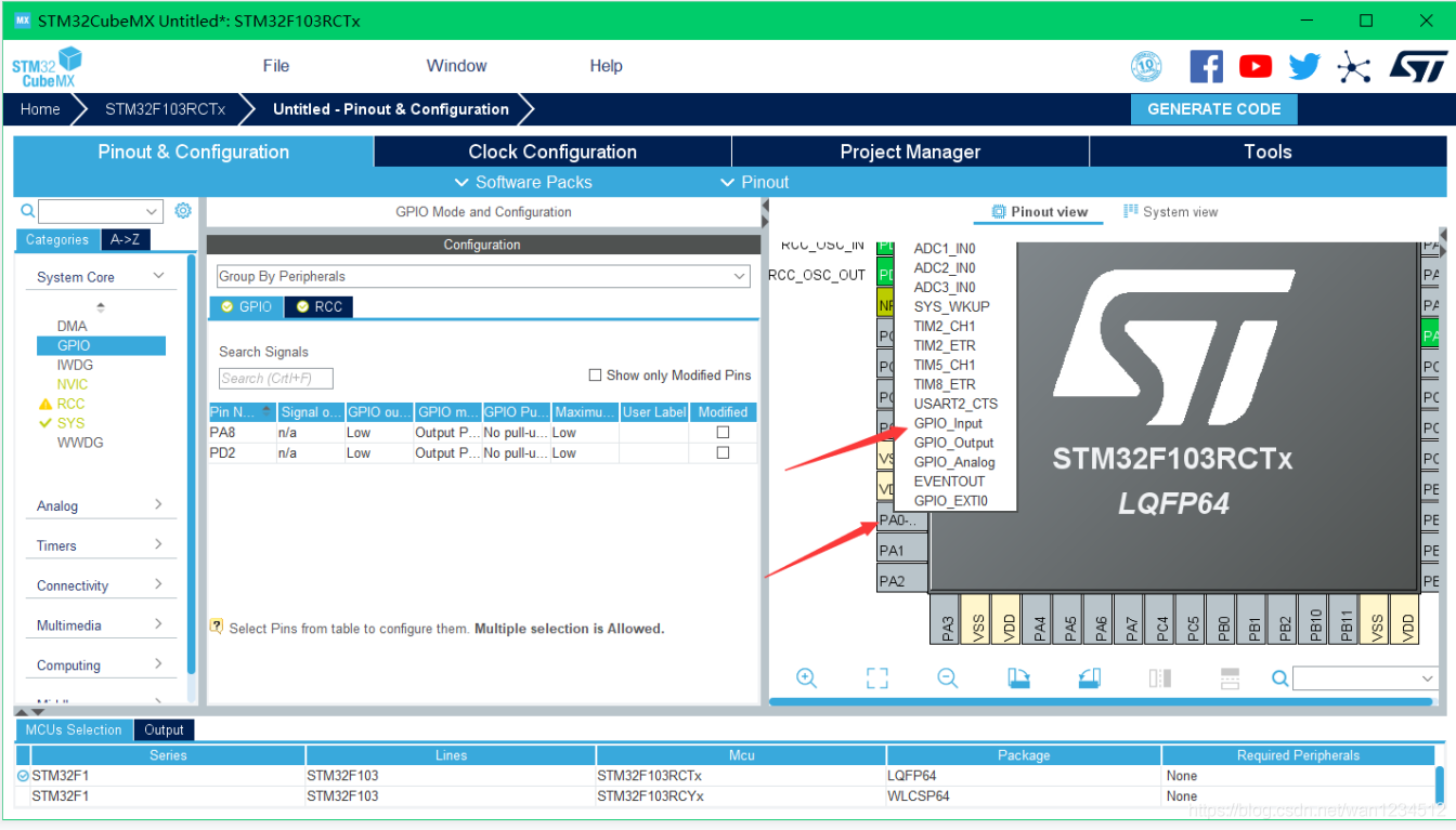 1、点击PA0,选择GPIO_Input,PC5,PA15同理。