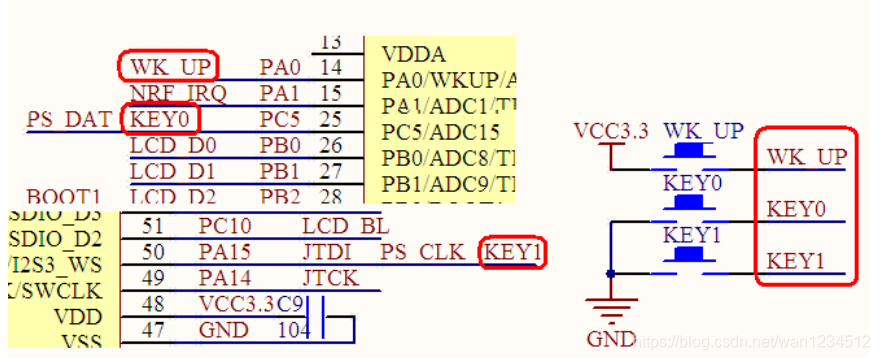 2、由原理图可得,PA0应配置下拉输入,其他两个应配置上拉输入