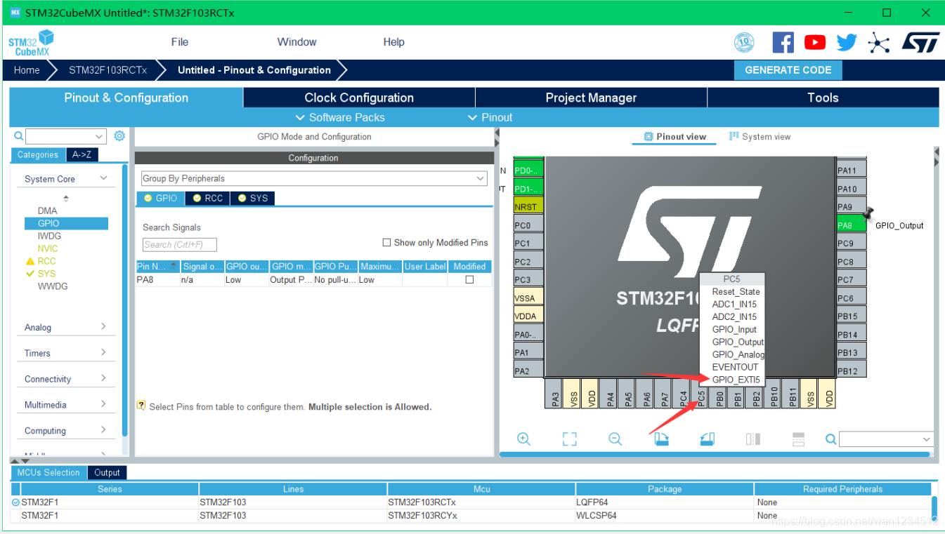 3、点击PC5,配置模式为外部中断下降沿触发。内部上拉