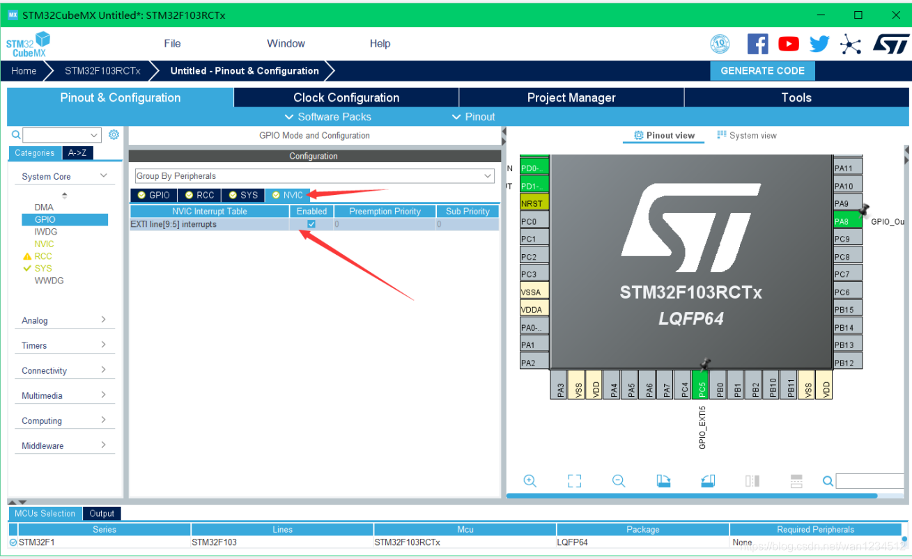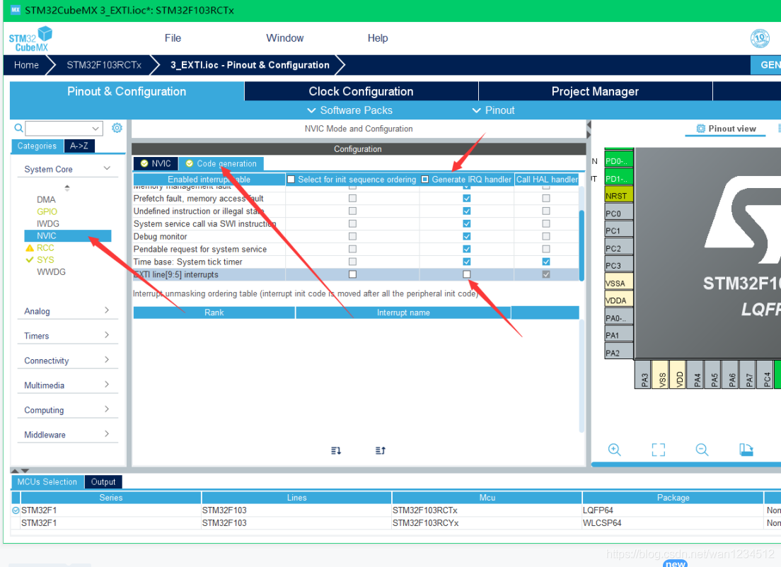 4、在NVIC的Code generation中,将外部中断线的Generate IRQ handler取消选中,然后生成代码,记得中断还是要使能,只是不生成中断服务函数代码。