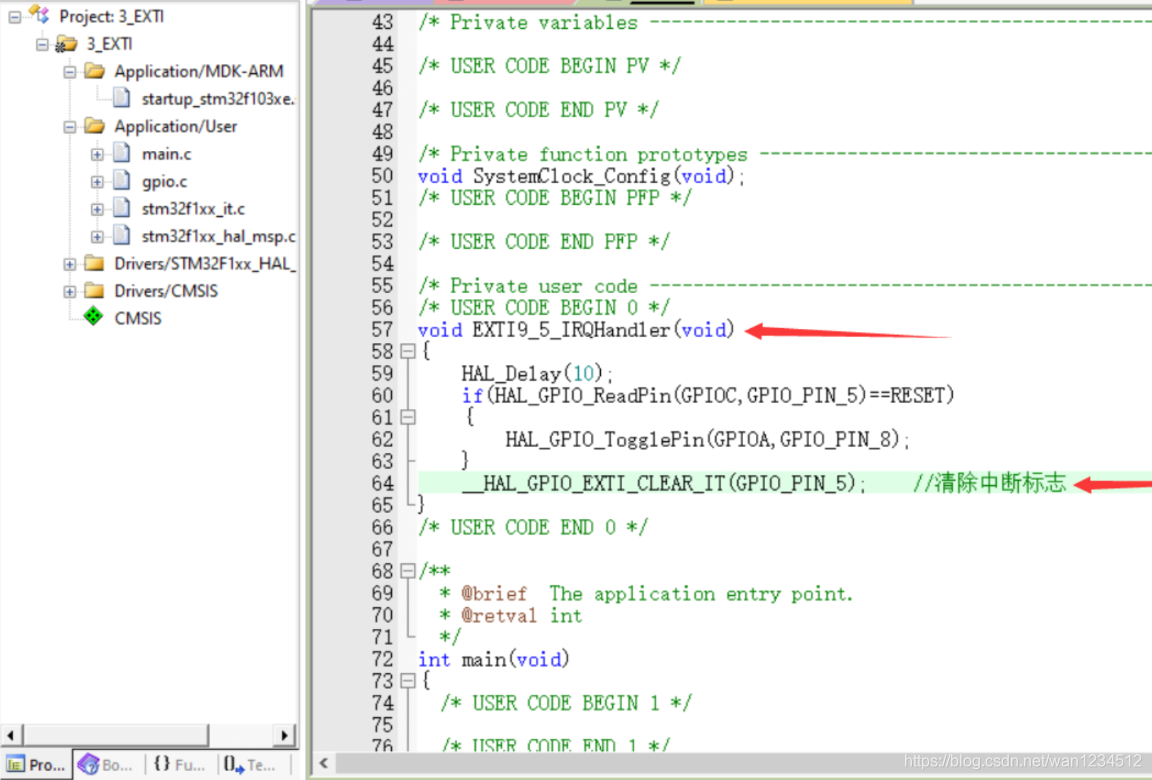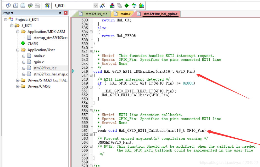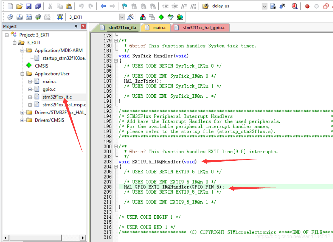 1、在stm32f1xx_it.c中有此外部中断的服务函数