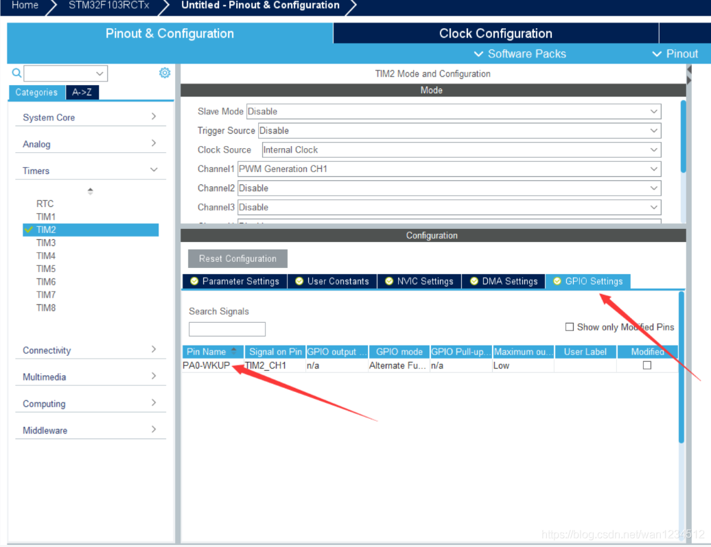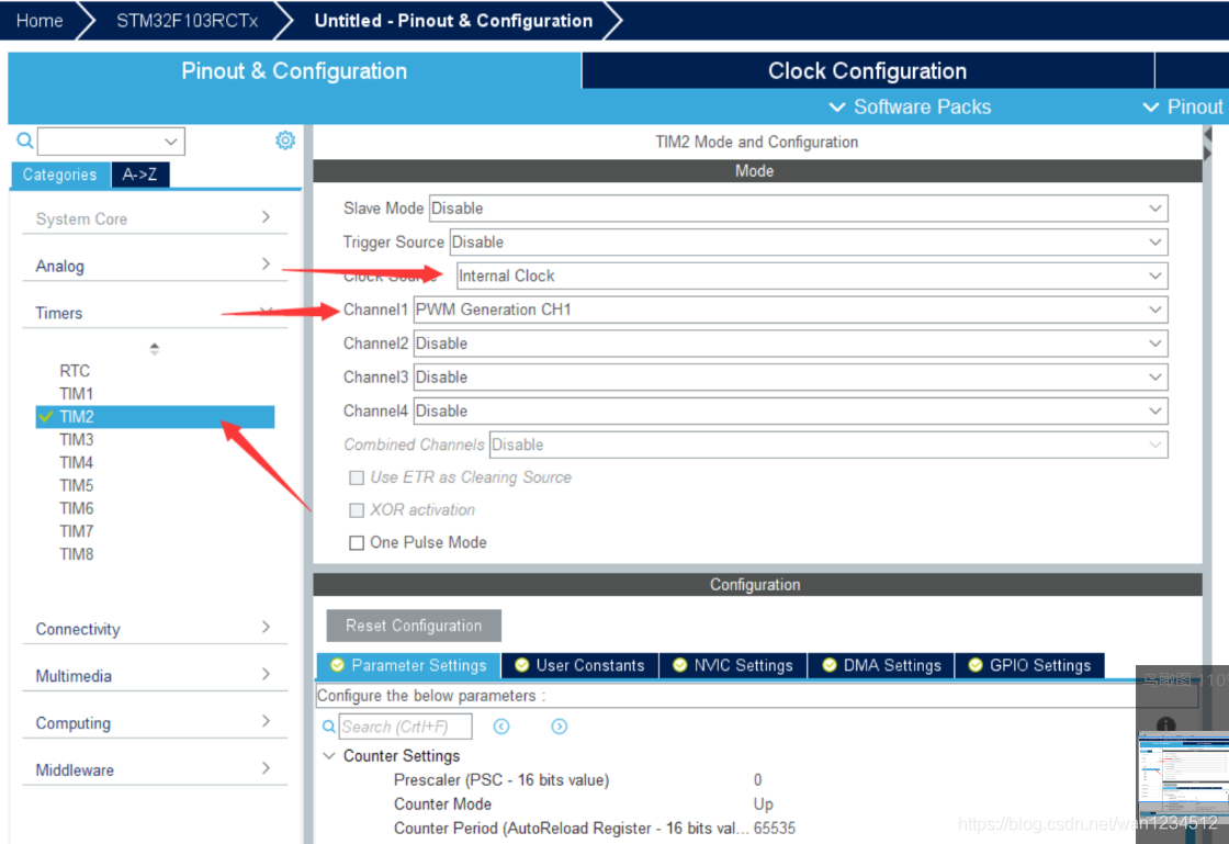 1、选择定时器2,时钟源选择Internal Clock,Channel1(通道1)选择PWM Generation CH1