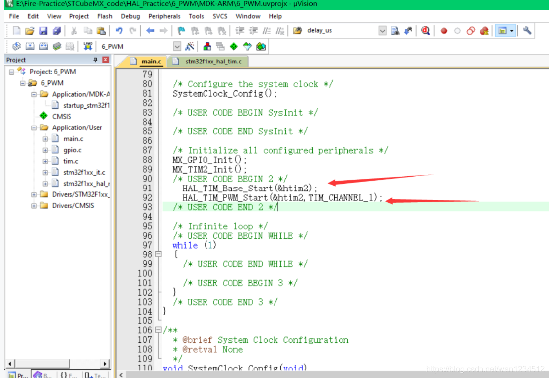 说明:有时候程序下载后不实现,可试着复位一下,也可在魔术棒配置中打开下载后复位。 (仅仅写了PWM配置部分,其余初始化以及工程配置未做说明)