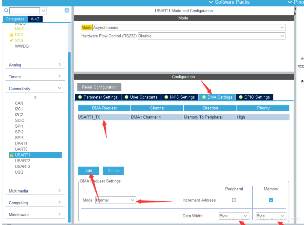 2、在DMA Setting中Add一个DMA,选择TX,优先级可选择High,DMA模式有循环传输和普通,这里选择普通模式,存储器自增勾上,数据宽度为Byte,字节。