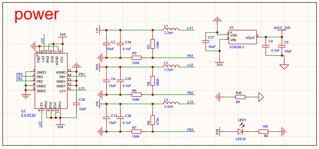 电源使用的是 EA3036作为电源管理芯片,生成1.2V,2.5V和3.3V,模拟电源部分使用的是XC6206-3降压的一个3.0的电源,