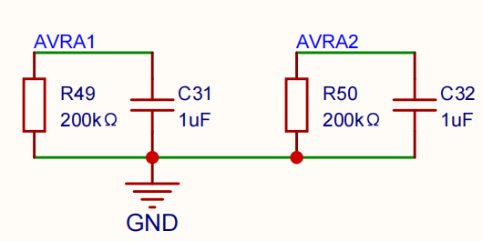 注意: AVRA1 和 AVRA2这里应该有个滤波电路,但是我当时设计的时候没有管,不知道会不会有影响,你们设计的时候可以加上,我在底板上做了这部分设计,但是我感觉底板上加这个就没啥用了。(但是实测是,就算我没加这部分,代码还是能跑起来,但是我估计可能会不稳定。)该部分的设计如图: