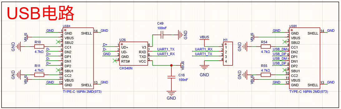 USB 电路包含两部分,一部分是连接串口的电路,一部分是连接USB的,就比较简单,串口我连接的是串口1,还用了普通的排针口引出,这样也可以使用 USB转TTL 这种模块先做简单测试。USB还兼顾提供 5V 电源的功能。