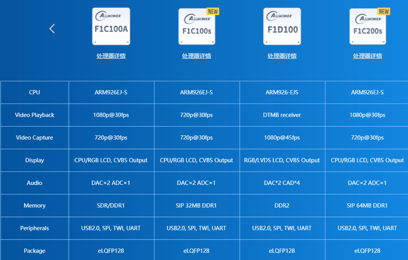 F1C100/200s基于ARM 9架构,芯片集成了SiP的DDR,外围电路可以极其简单;它支持高清视频解码,包括H.264、H.263、MPEG ½/4等,还集成了音频编解码器和I2S/PCM接口,是一款开发简单、性价比较高的产品,也适合用来做入门级的Linux开发板。
