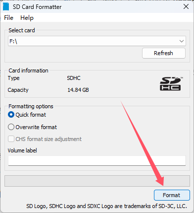 使用SDCardFormatter先将SD卡格式化。