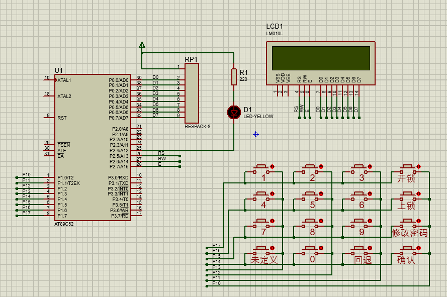 LM016L显示提示信息,LED灯作为模拟锁,主控是89C52,使用矩阵按键。